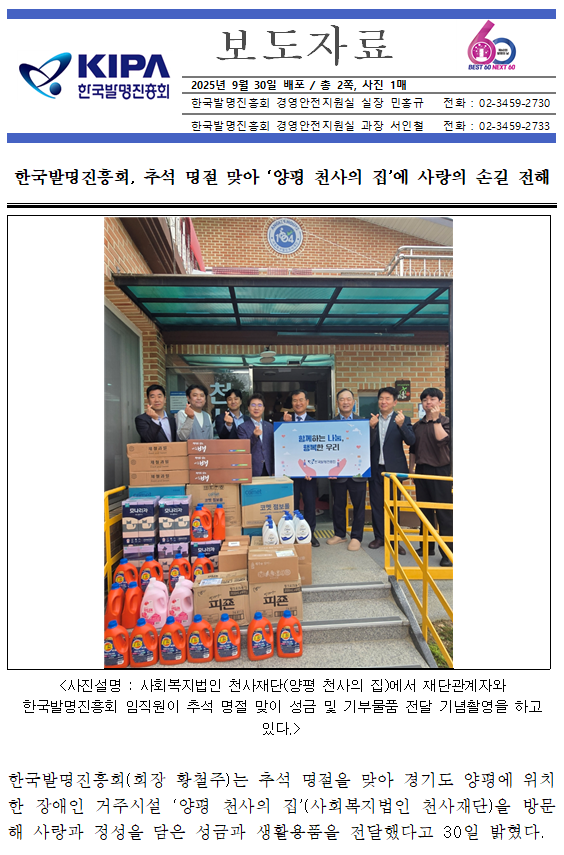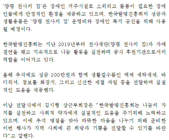 제목 | [보도자료] 한국발명진흥회, 추석 명절 맞아 '양평 천사의 집'에 사랑의 손길 전해 | ||||