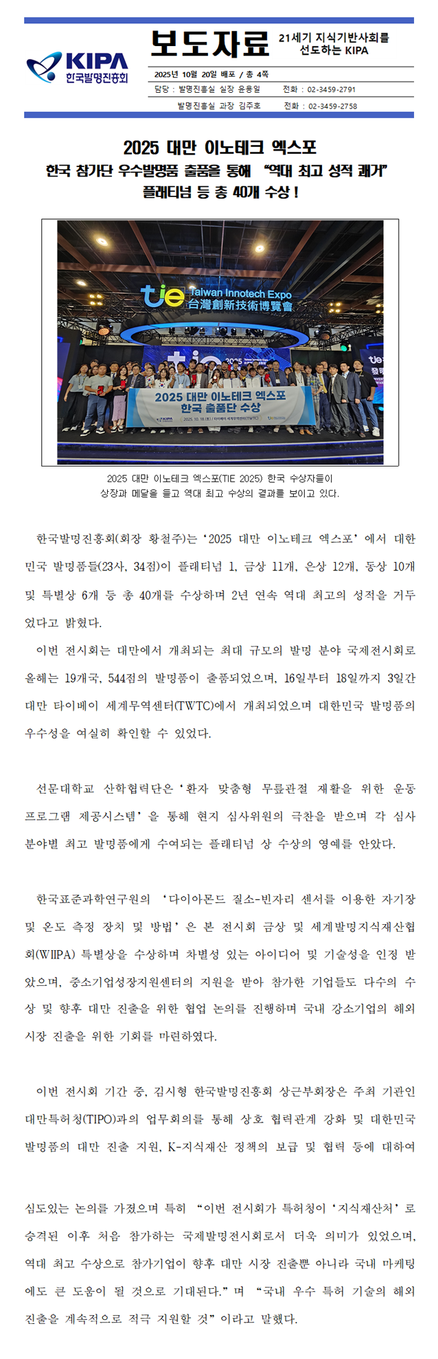 제목 [보도자료] ]한국발명진흥회, '대만 이노테크 엑스포' 한국 참가단 '플래티넘 등 총 40개' 수상