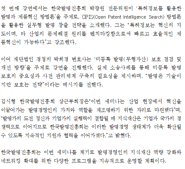 제목 [보도자료] 한국발명진흥회, '발명경영인을 위한 지식재산 창출보호 전략 세미나' 개최