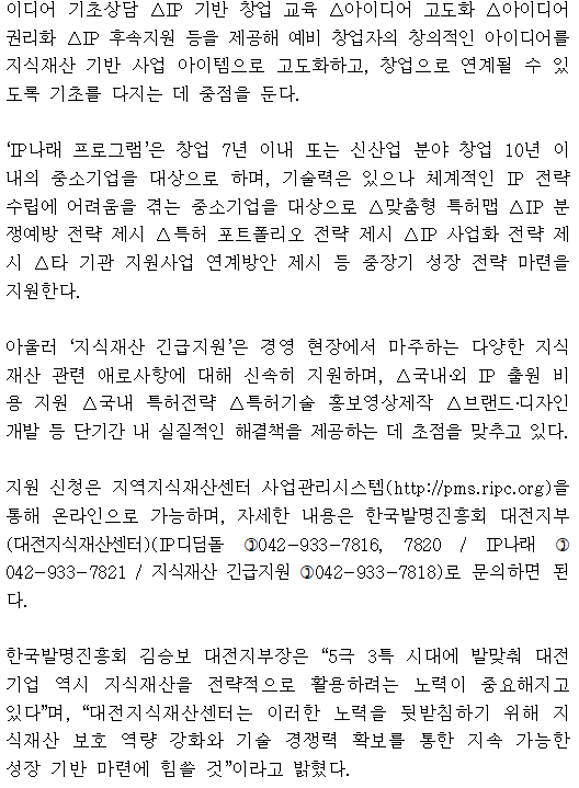 제목 [보도자료] 한국발명진흥회 대전지부, 예비창업자·중소기업 대상 2026년 맞춤형 IP 지원사업 참여기업 모집