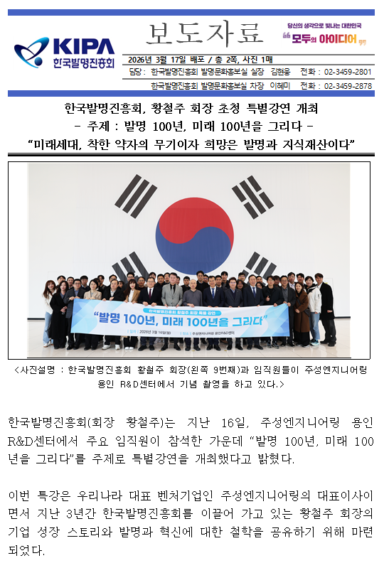 제목 [보도자료] 한국발명진흥회, 황철주 회장 초청 특별강연 개최