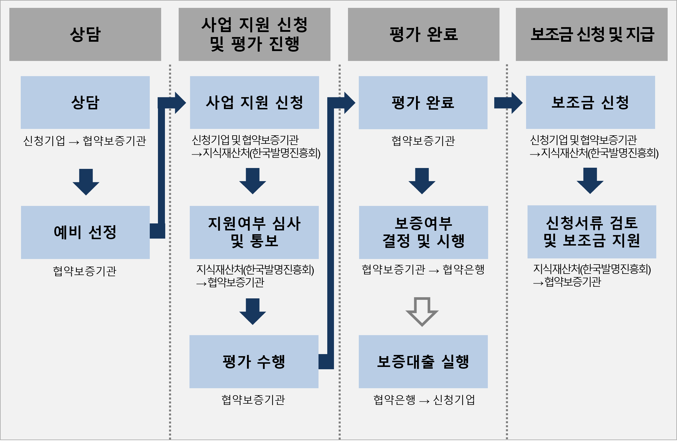 지원내용 : 발명 등의 평가기관이 수행하는 지식재산가치평가에 대하여 평가비용을 지원하고, 보증기관은 가치평가 결과금액 이내에서 보증 지원