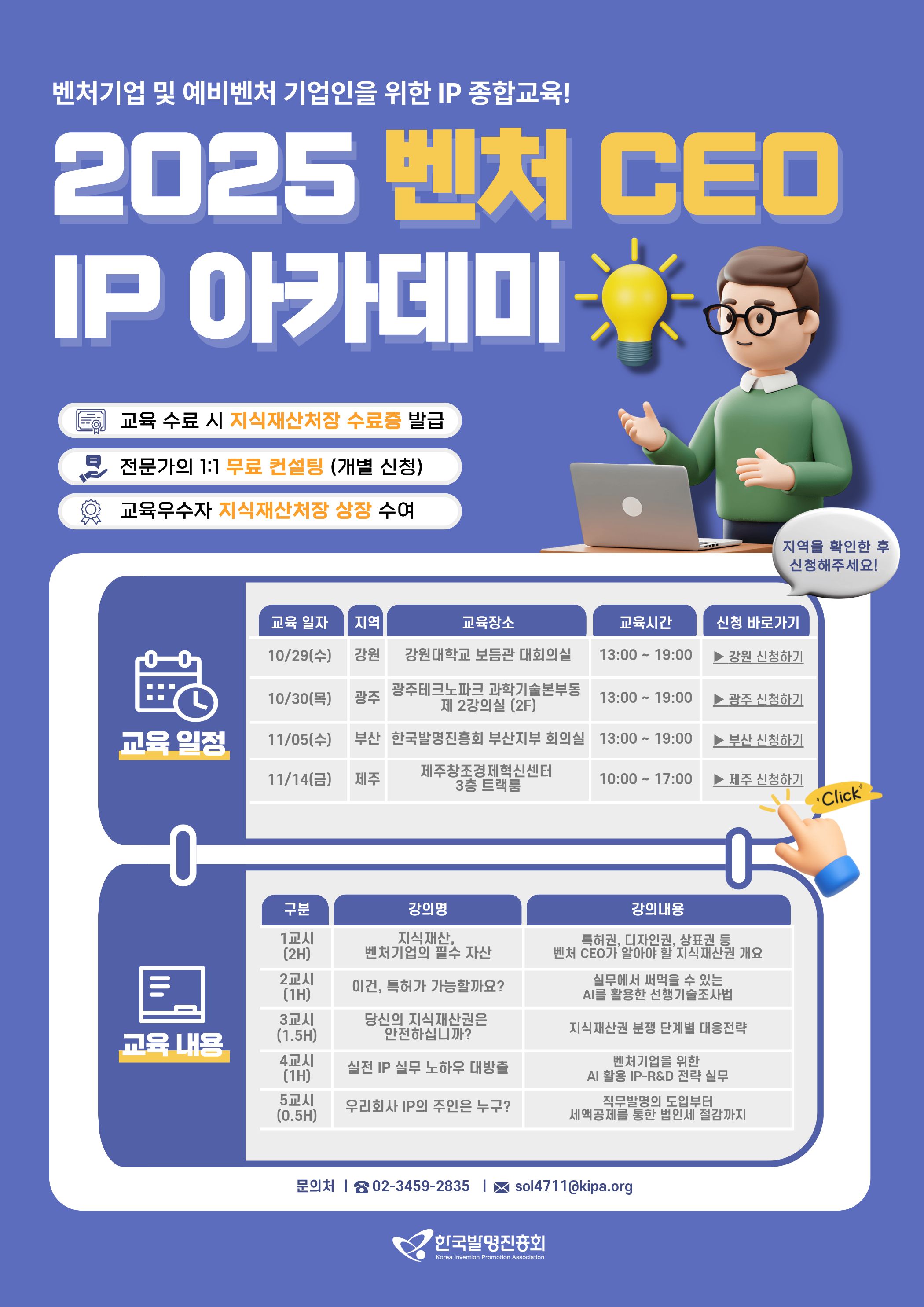 | 제목 | [공지사항] 2025 벤처 CEO IP 아카데미 수강생 모집안내 | ||||