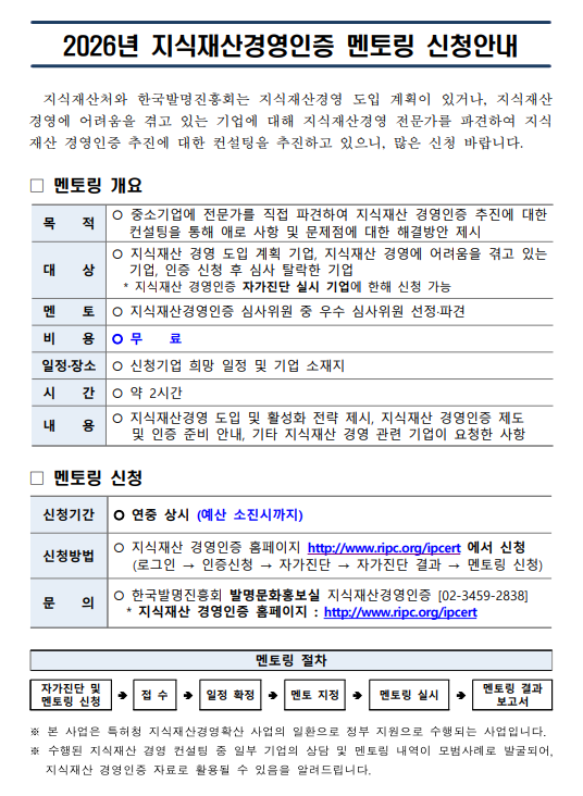| 제목 | 2026년도 지식재산 경영인증 멘토링 신청안내 | ||||