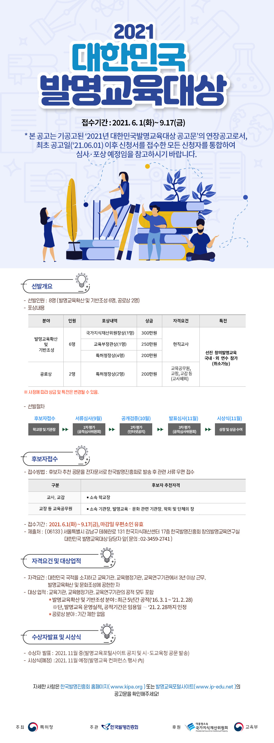 * 본 공고는 기공고된 ‘2021년 대한민국발명교육대상 공고문’의 연장공고로서, 최초 공고일(‘21.06.01) 이후 신청서를 접수한 모든 신청자를 통합하여 심사·포상 예정임을 참고하시기 바랍니다.