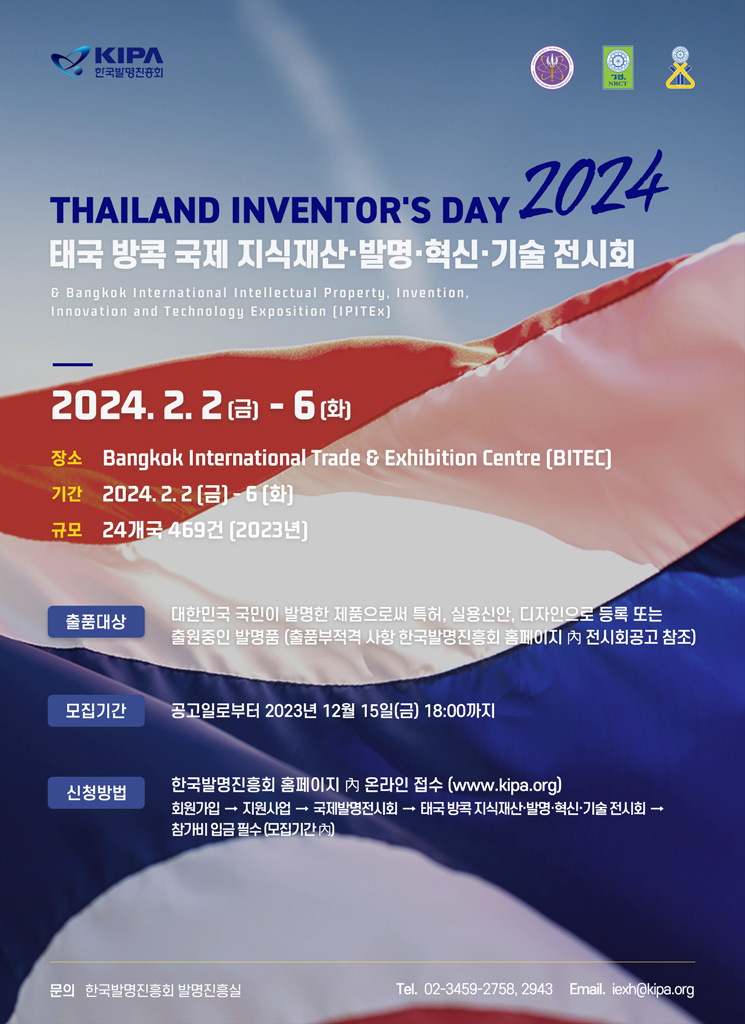 2024 태국 방콕 지식재산·발명·혁신·기술 전시회 관련 출품 모집안내를 첨부와 같이 공고하오니 많은 관심과 참여 바랍니다