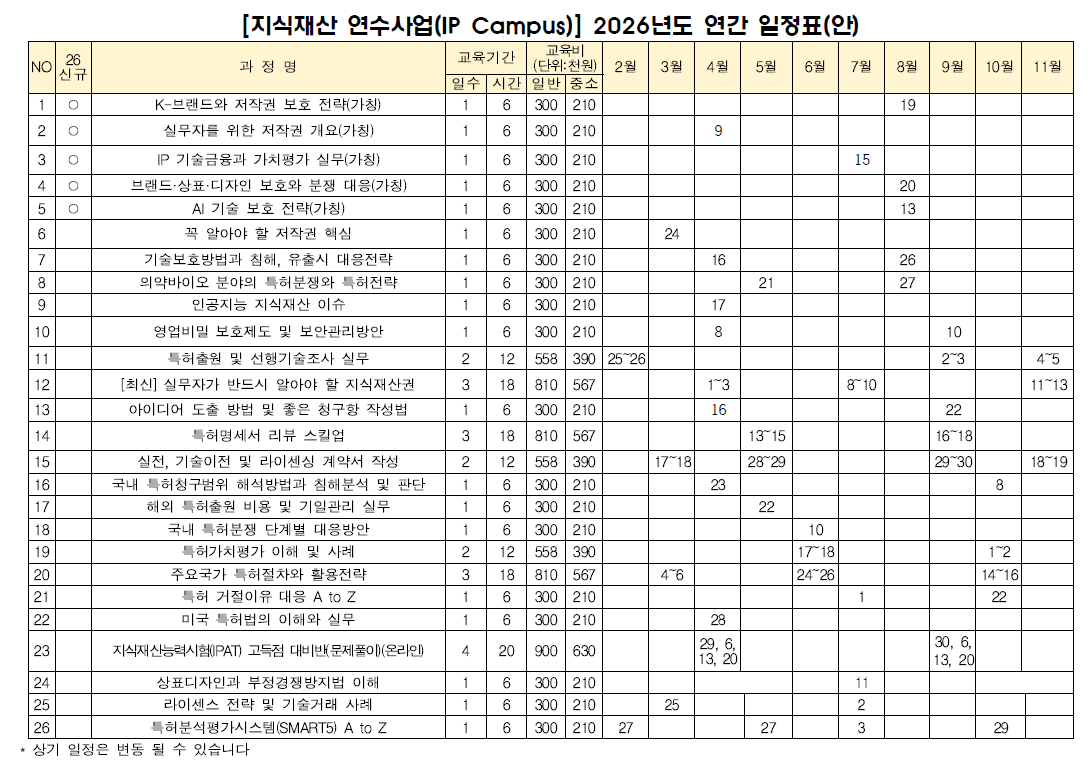 | [일반 교육] 2026년 IP Campus 연간 일정표 재안내(0413 기준) | |