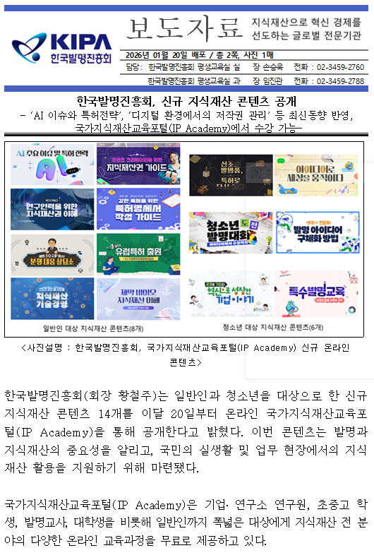 제목 [보도자료] 한국발명진흥회, 신규 지식재산 콘텐츠 공개