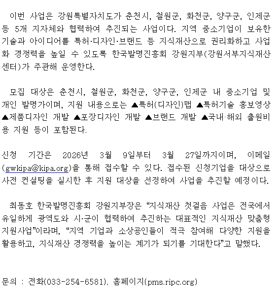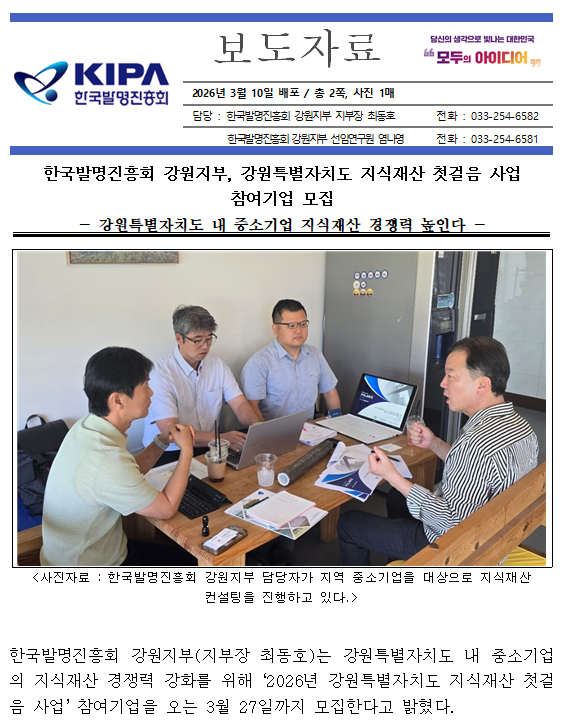 제목 [보도자료] 한국발명진흥회 강원지부, 강원특별자치도 지식재산 첫걸음 사업 참여기업 모집