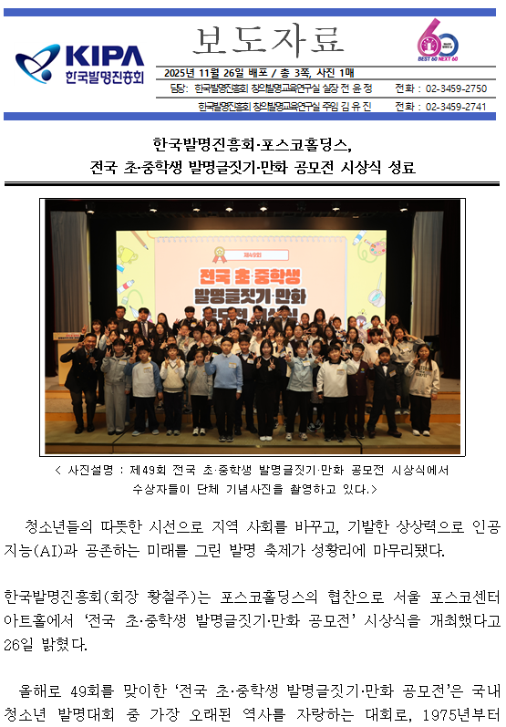 제목 [보도자료] 한국발명진흥회·포스코홀딩스, 전국 초·중학생 발명글짓기·만화 공모전 시상식 성료