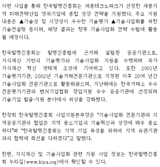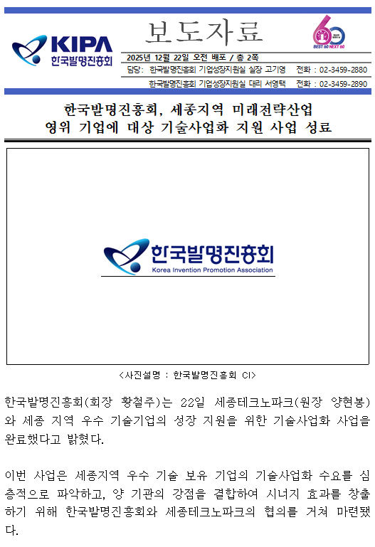 제목 [보도자료] 한국발명진흥회, 세종지역 미래전략산업 영위기업 대상 기술사업화 지원사업 성료