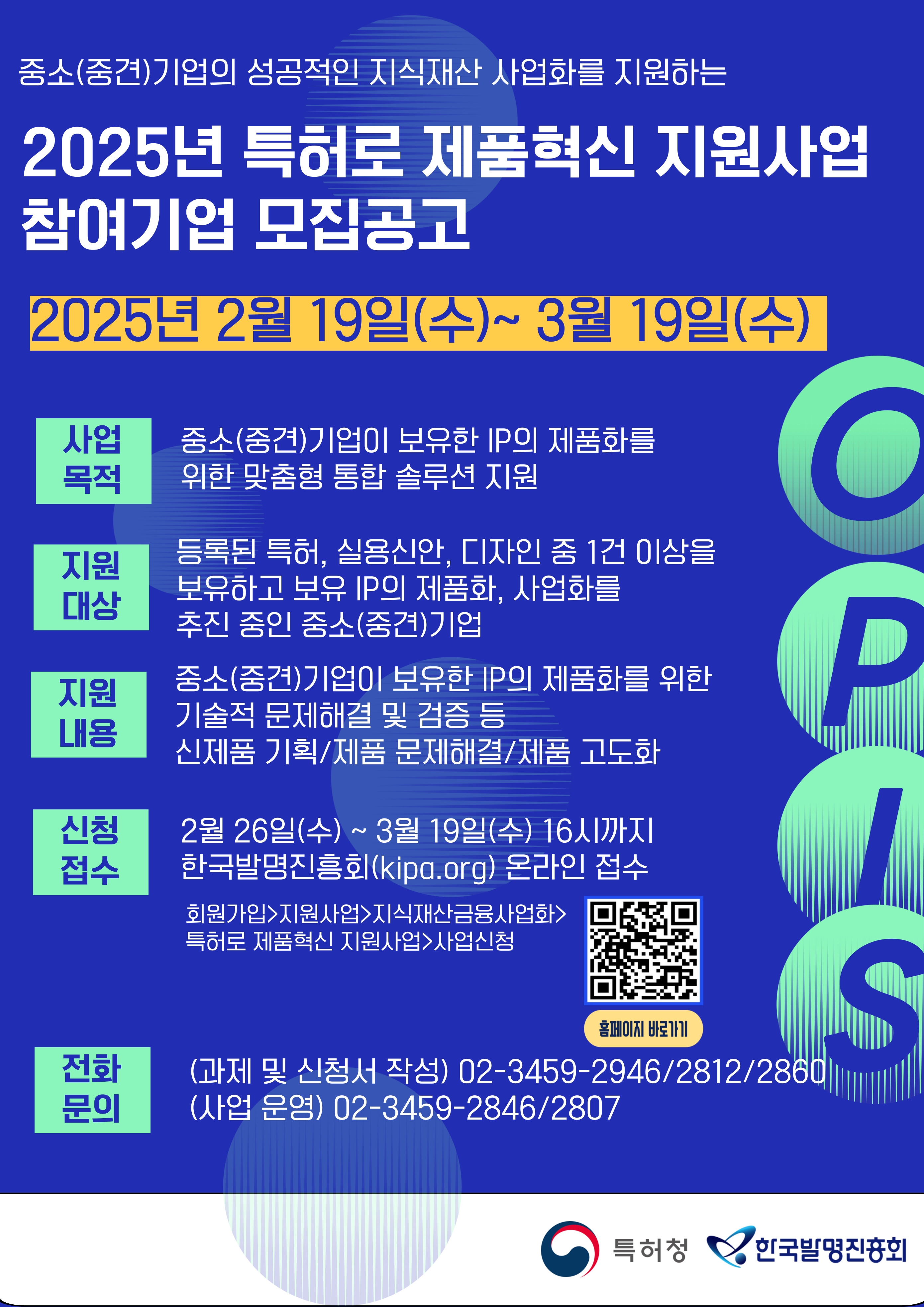 ■ 신청기간: 2025. 2. 26.(수) ~ 2025. 3. 19.(수), 16시까지 ■ 신청방법: 한국발명진흥회 홈페이지를 통한 온라인 신청(www.kipa.org) (한국발명진흥회 홈페이지 → 지원사업 → 지식재산금융·사업화 →특허로 제품혁신 지원사업 → 사업신청(특허로 제품혁신 단독형))