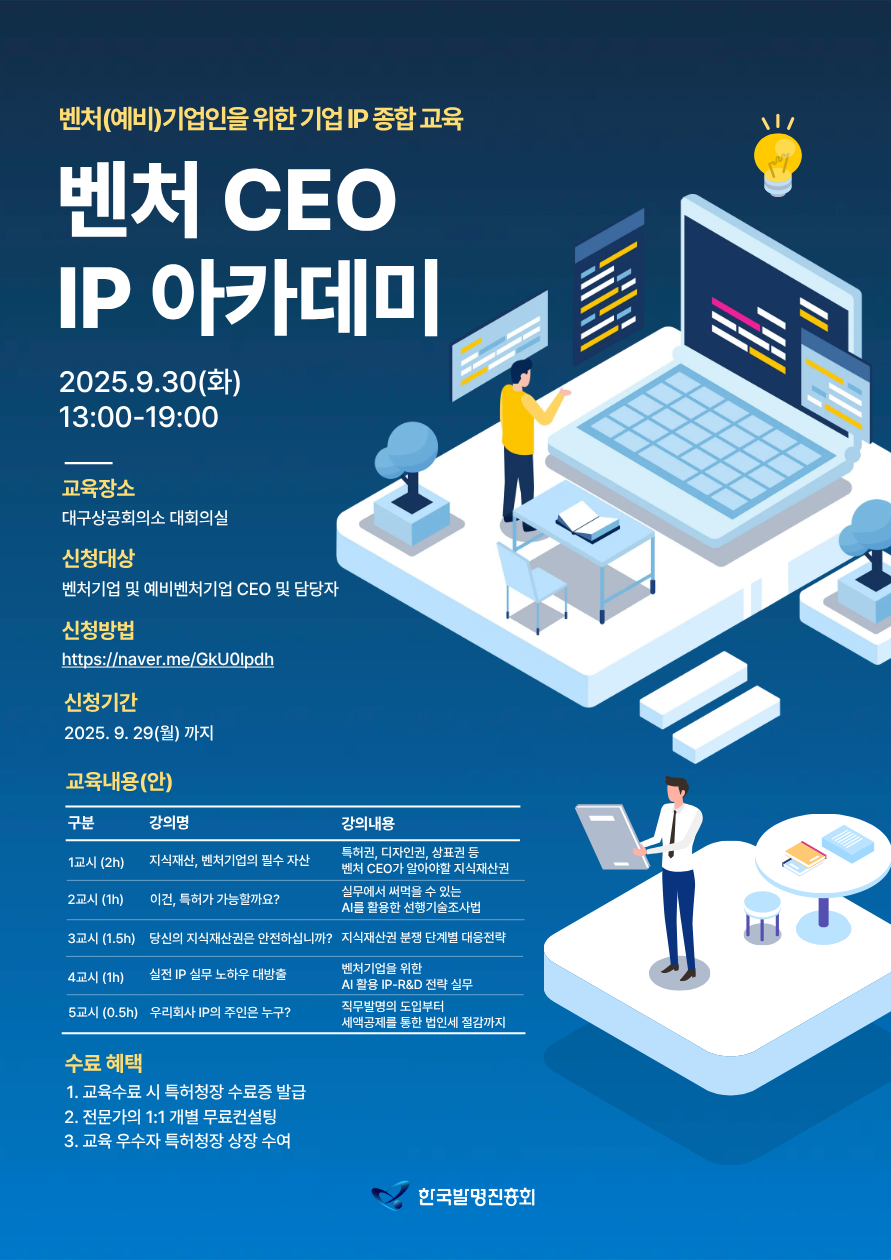 | 제목 | [한국발명진흥회] 벤처 CEO IP 아카데미 교육 안내(09.30) | ||||