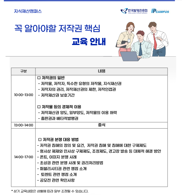 제목 | [IP Campus] 꼭 알아야할 저작권 핵심(저작권의 이해)(11/13, 오프라인 교육) | ||||