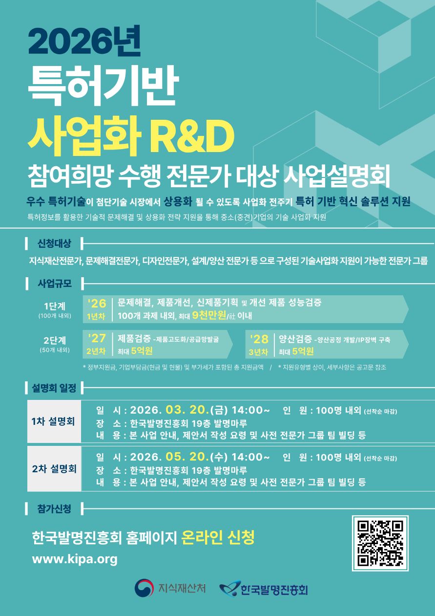| 제목 | 2026년 특허기반 사업화 R&D 참여 희망 수행 전문가 대상 사업설명회 개최 안내 | ||||