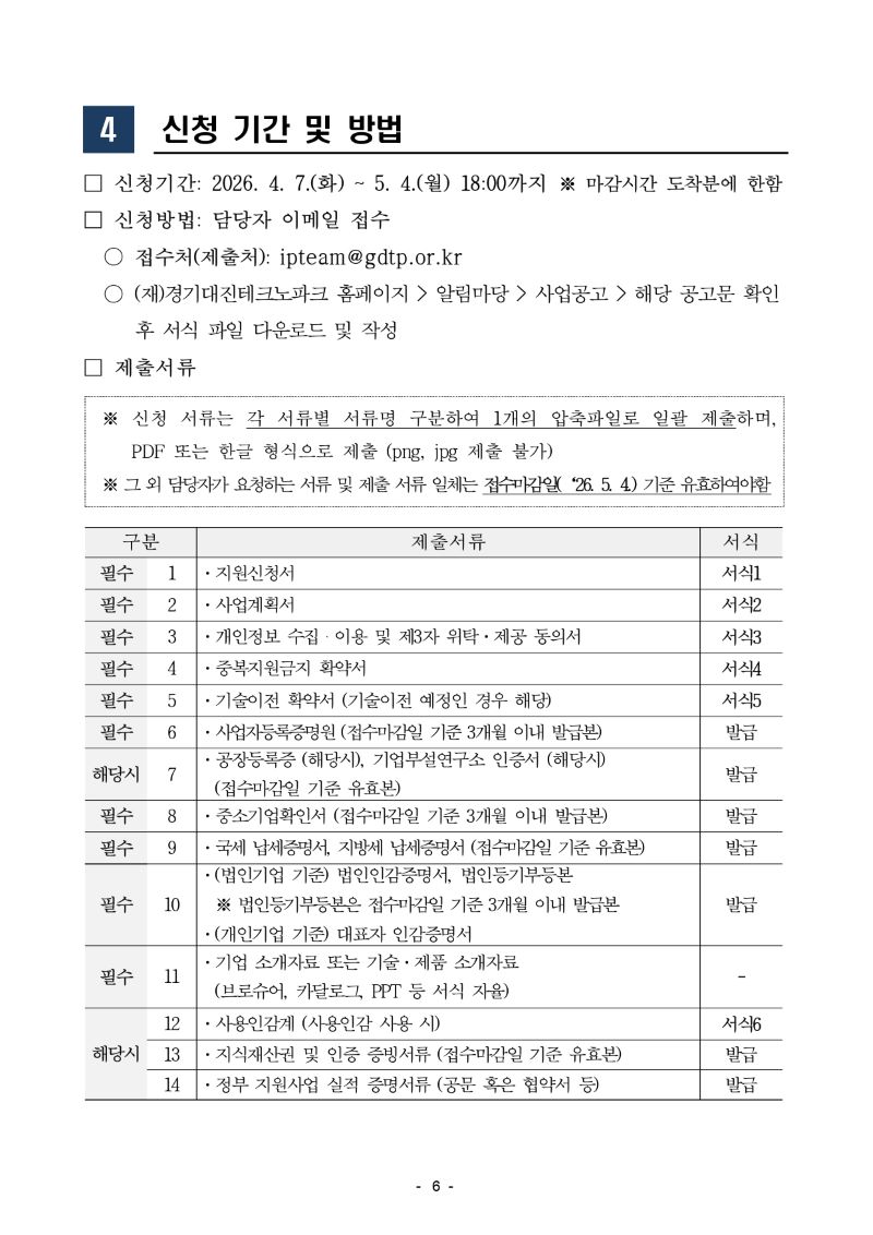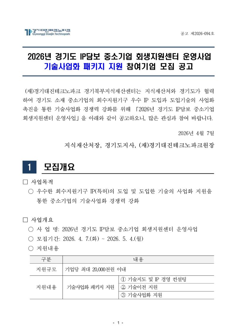 | 제목 | [경기대진테크노파크] 2026년 경기도 IP담보 중소기업 회생지원센터 운영사업 기술사업화 패키지 지원 모집 공고 | ||||