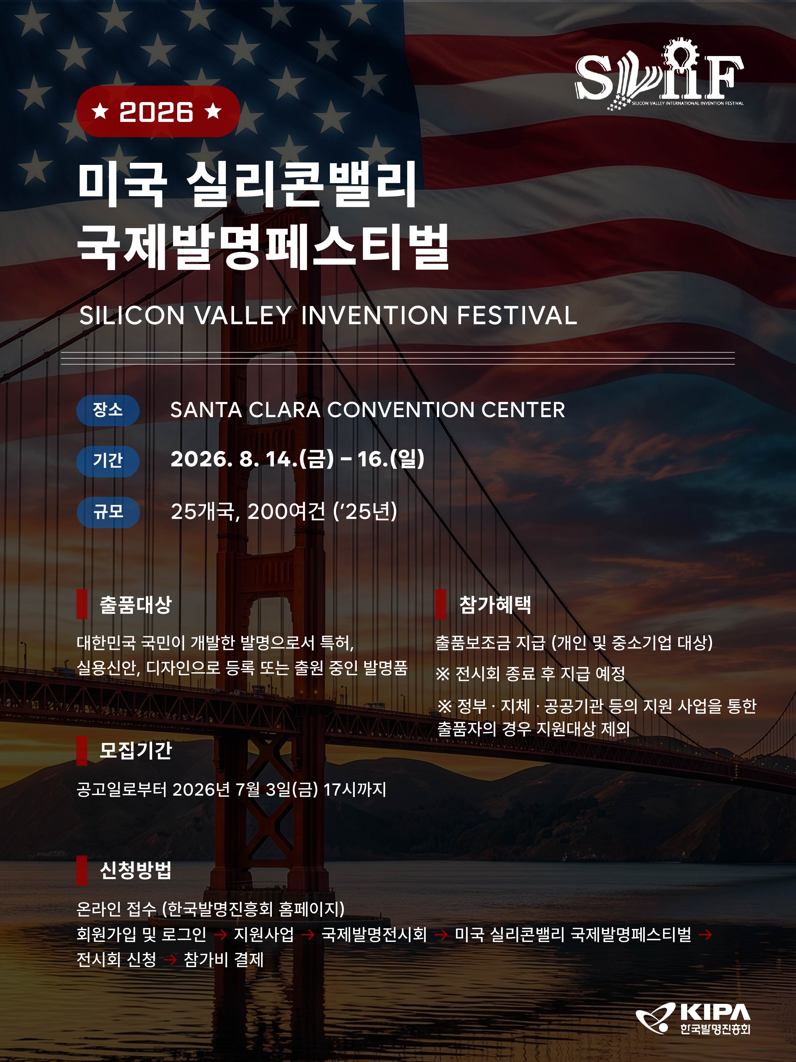 ㅇ 신청방법 : 한국발명진흥회 홈페이지 회원가입 → 지원사업 → 국제발명전시회 → 미국 실리콘밸리 국제발명페스티벌 → 전시회 신청 → 참가비 결제 ㅇ 전시기간 : 2026. 8. 14.(금) ~ 8. 16.(일) / ※ 8. 13.(목) 부스 설치 ㅇ 개최장소 : 미국 캘리포니아주 산타클라라 컨벤션센터 (Santa Clara Convention Center) ㅇ 첨부 : 2026년 미국 실리콘밸리 국제발명페스티벌 참가 모집 공고 ㅇ 문의 : 한국발명진흥회 발명진흥실(02-3459-2758/2943, iexh@kipa.org)