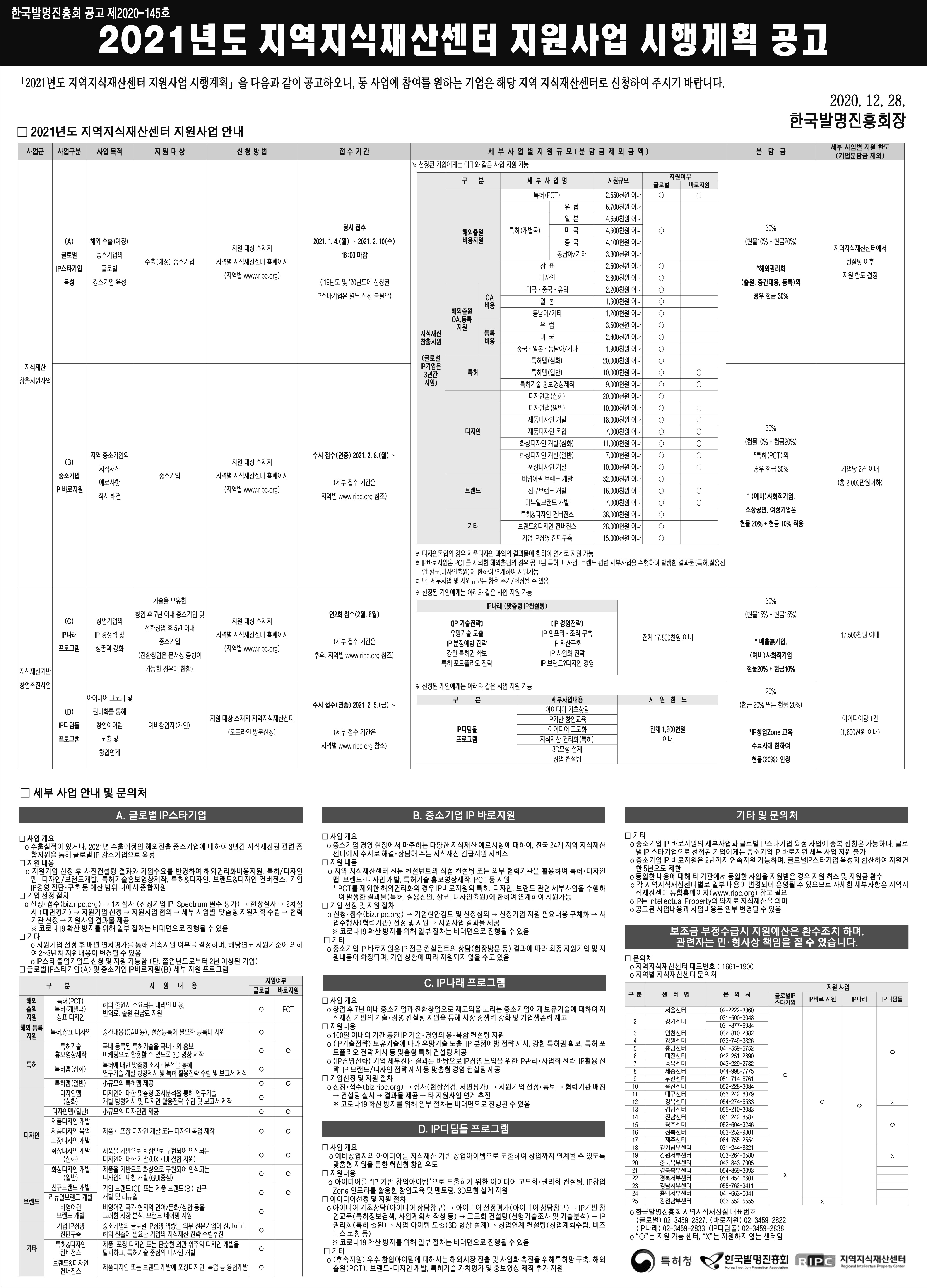 한국발명진흥회 공고 제2020-145호「20201년 지역지식재산센터 지원사업 시행계획 공고 」「2021년도 지역지식재산센터 지원사업 시행계획」을 첨부와 같이 공고하오니,동 사업에 참여를 원하는 기업은 해당 지역 지식재산센터로 신청하여 주시기 바랍니다.2020. 12. 28한국발명진흥회장 |
