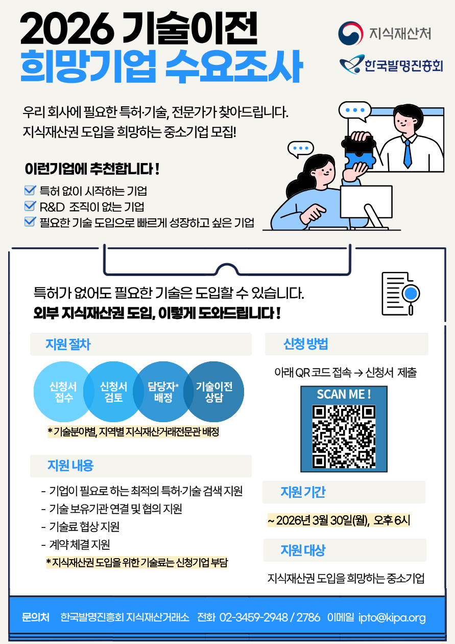 안녕하십니까, 한국발명진흥회 지식재산거래소입니다. 지식재산처와 한국발명진흥회는 국내 지식재산 시장의 활성화와 중소기업의 경쟁력 강화를 위해, 지식재산권 거래·협상을 지원하고 있습니다. 이에 2026 기술이전 희망기업 수요조사를 진행하고자 하오니, 관심 있으신 중소기업의 많은 관심과 신청 바랍니다!