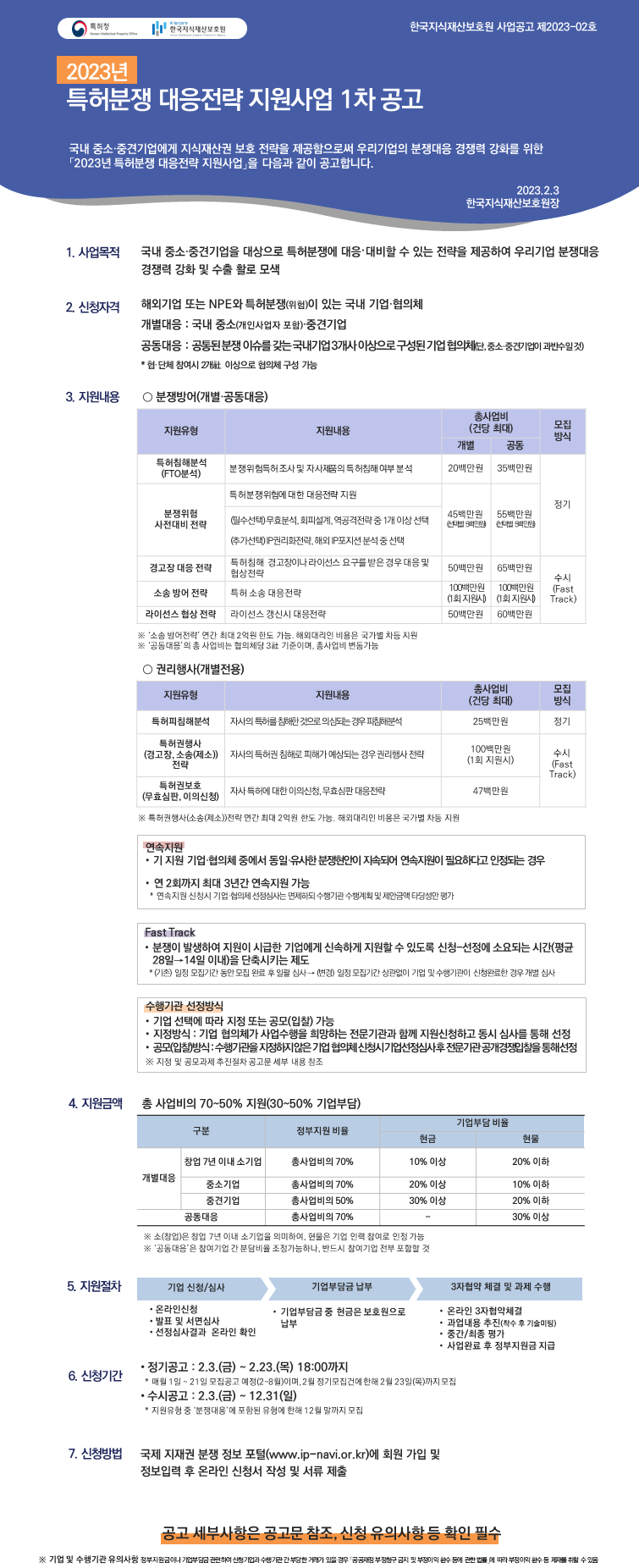 | 제목 | [한국지식재산보호원] 2023년 특허분쟁 대응전략 지원사업 1차 공고 안내 | ||||