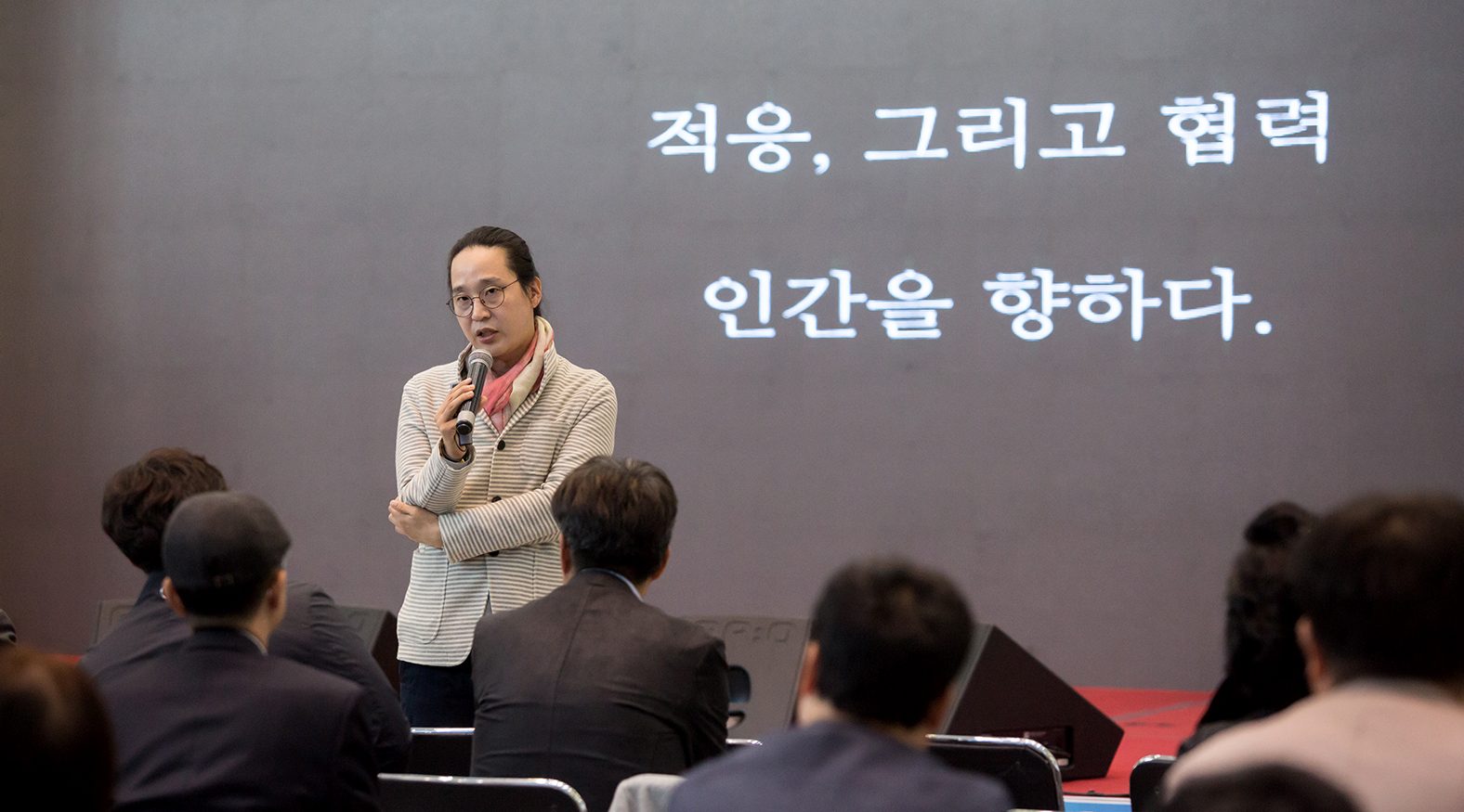 “사회는 너무 빠르게 변화합니다. 두렵고 걱정되죠. 우리는 어떻게 적응해야할까요. 원래 직업은 협력의 모델에서 나왔습니다. 한 사람이 집도 짓고 농사도 짓고 빵도 굽고 하는 게 어려우니 나눠서 일하게 된 거죠. 그런데 지금은 협력의 모델을 도외시하고 직업 자체가 목적이 돼버렸죠. 당신의 직업은 이제 무엇을 파는 게 아니라 주는 것이 되어야 합니다. 그래야 세상에 살아남을 수 있습니다. 매출이나 시장에서의 목표부터 이야기하는 것은 이미 이기적이며, 이기적인 것은 오래 갈 수 없습니다.”