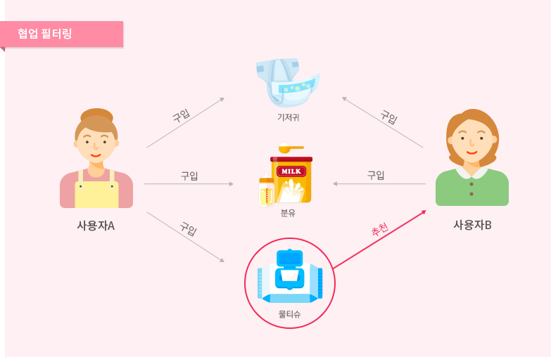 비슷한 관심사를 가진 다른 사용자가 좋아한 콘텐츠나 제품을 추천한다.